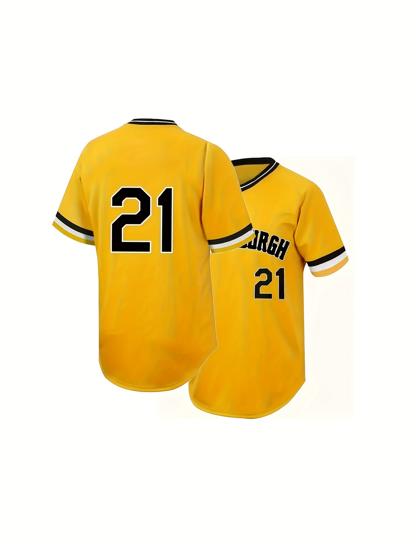 Men's #21 Yellow Baseball Jersey with Embroidered Name & Number - 100% Polyester, V-Neck, Loose Fit for Sports & Parties, Machine Washable, All-Season Comfort, Baseball Apparel | Striped Sleeves | Glossy Finish