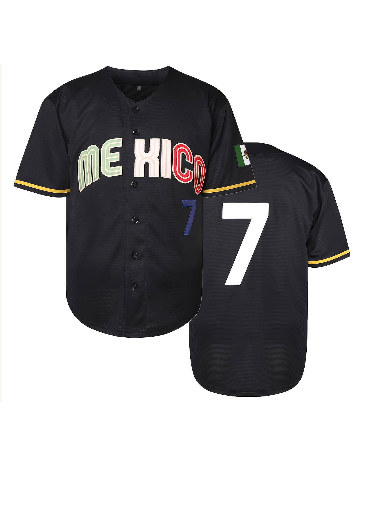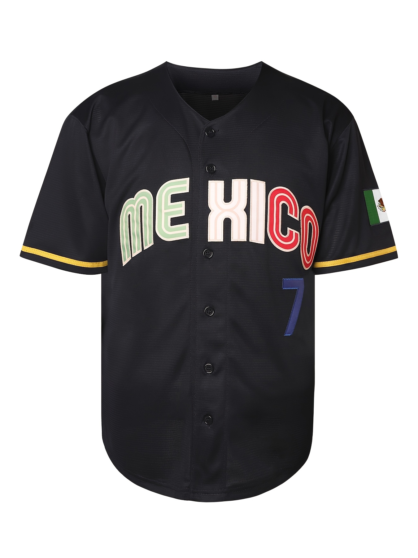 Men's #7 Mexico Baseball Jersey - V-Neck, Embroidered Name & Number, Loose Fit, Polyester, Black with Colorful Stripes, Perfect for Sports, Parties & Casual Wear