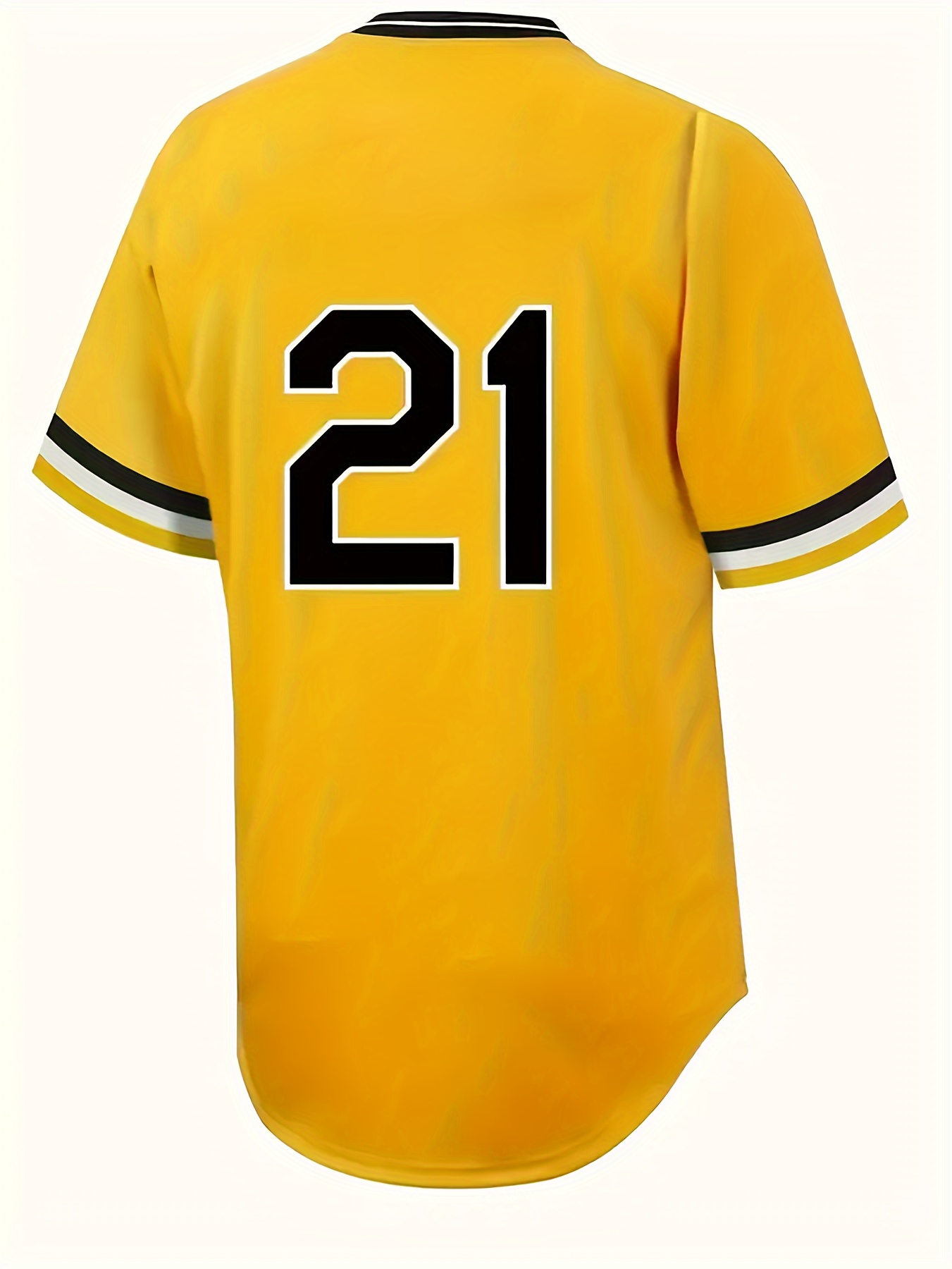 Men's #21 Yellow Baseball Jersey with Embroidered Name & Number - 100% Polyester, V-Neck, Loose Fit for Sports & Parties, Machine Washable, All-Season Comfort, Baseball Apparel | Striped Sleeves | Glossy Finish